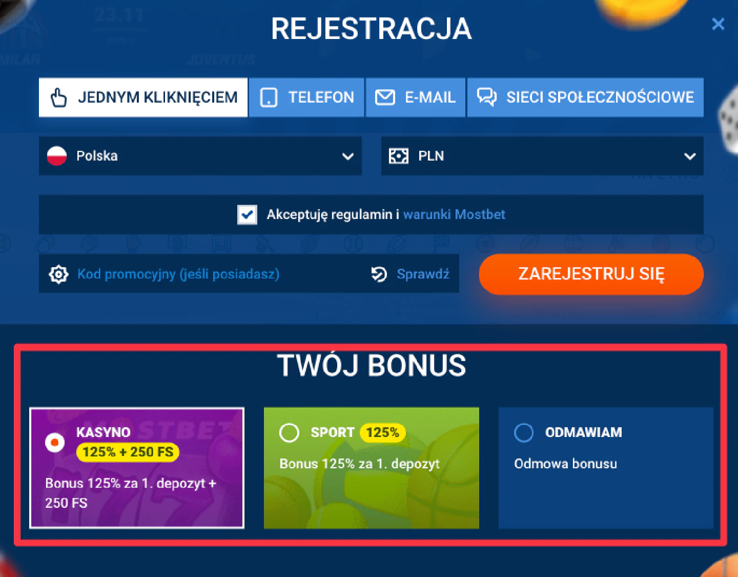 - Wybierz bonus: Podczas rejestracji zaznacz pole wyboru bonusu powitalnego, który Cię interesuje – na zakłady sportowe lub na kasyno. Zwróć uwagę, że możesz wybrać tylko jeden bonus powitalny.