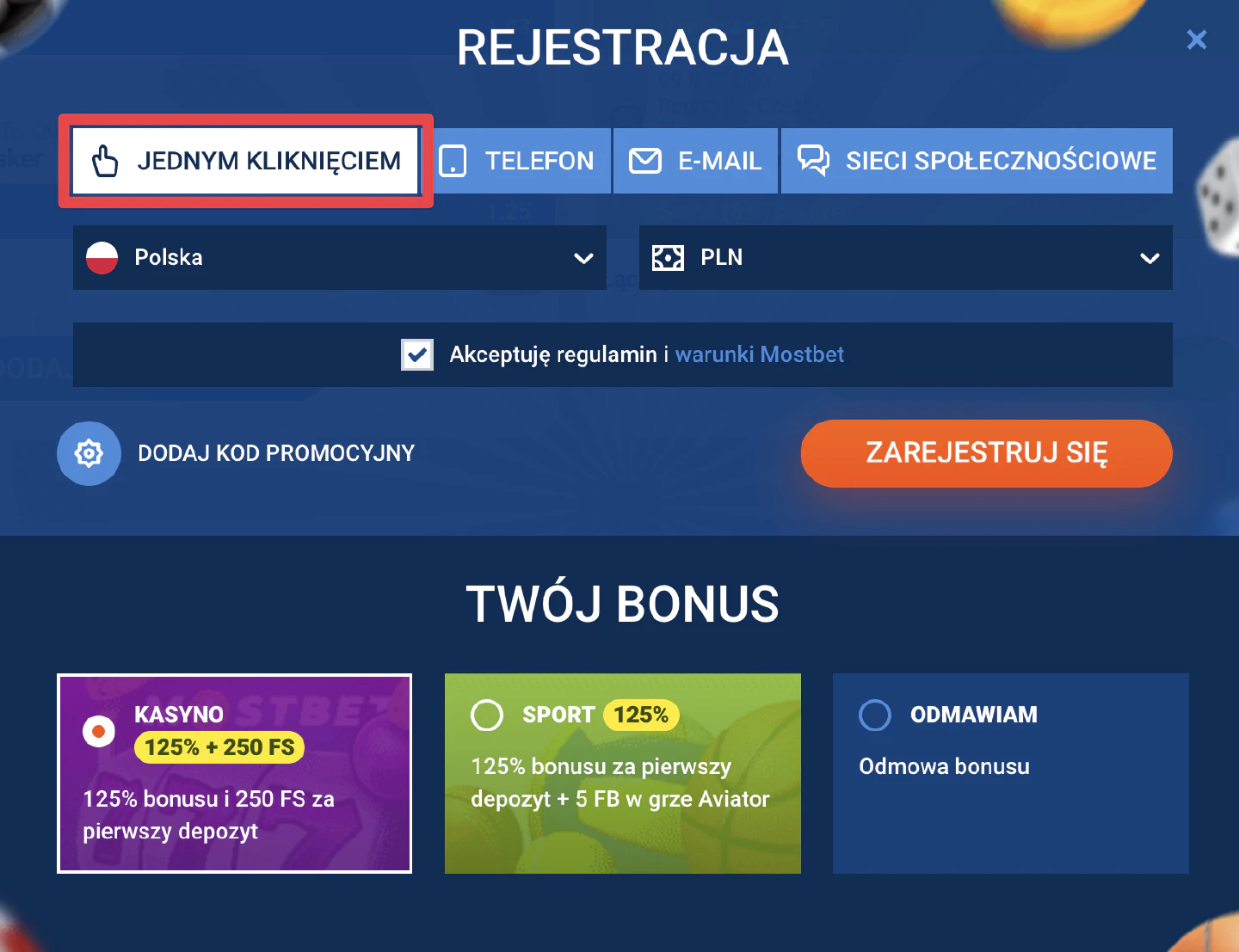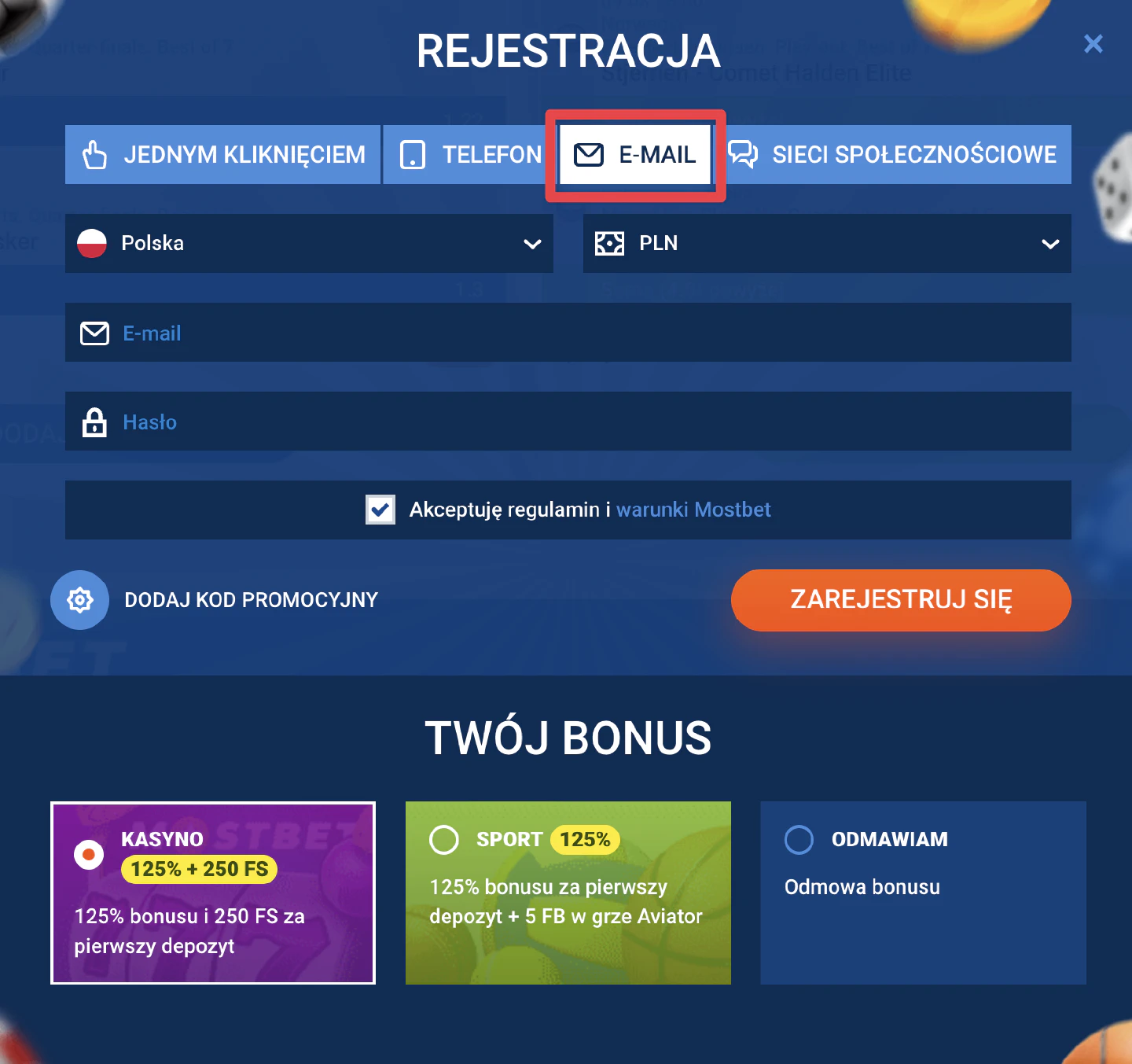 - Zarejestruj się w MostBet, wybierając jedną z opisanych powyżej metod.