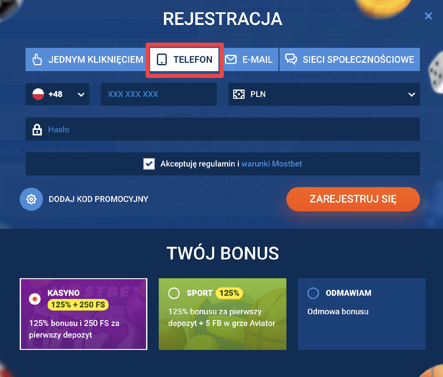 - Zaznacz pole, potwierdzając, że akceptujesz Regulamin i Politykę Prywatności MostBet.
