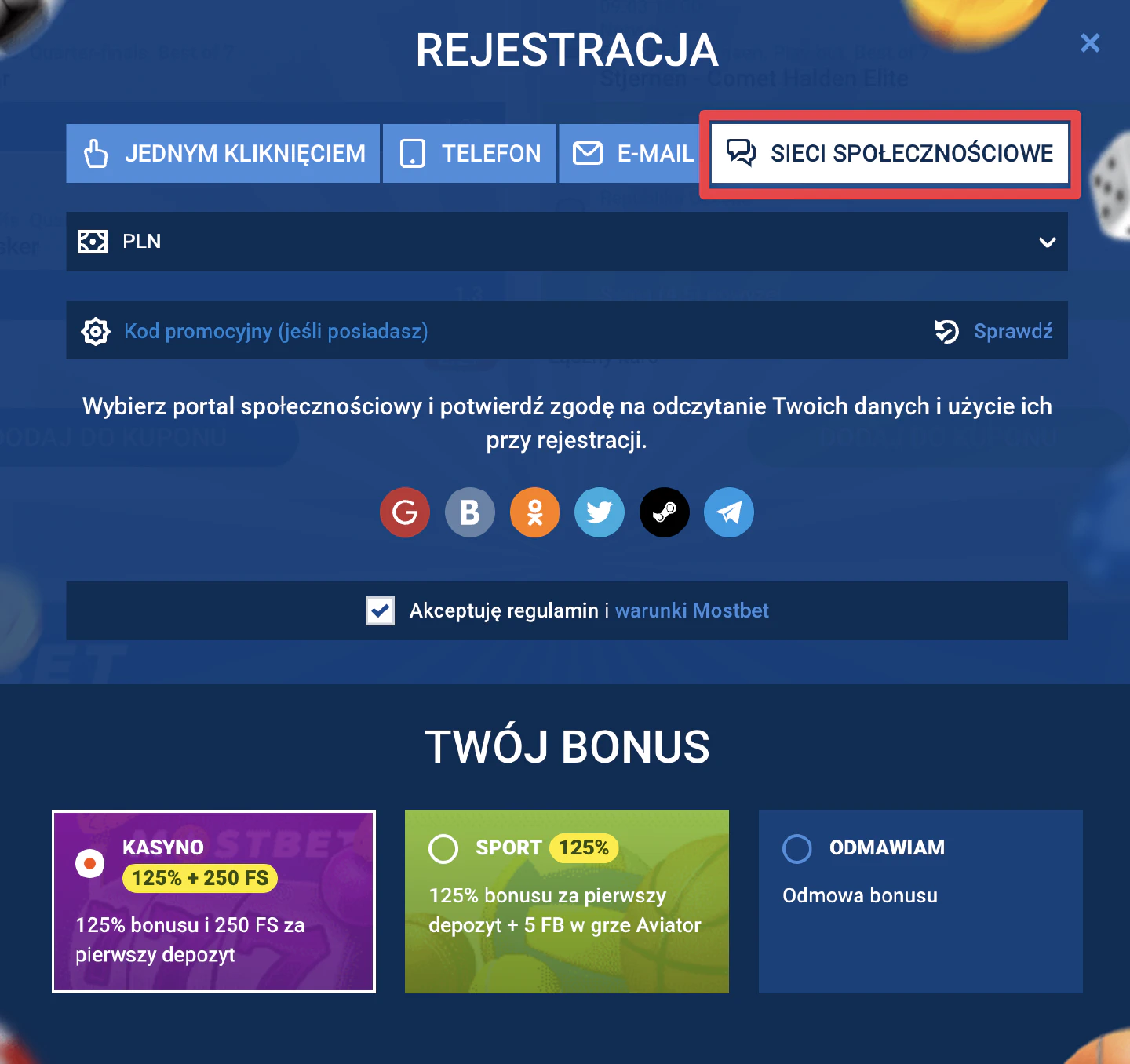 Jeśli posiadasz konto na Facebooku, Google, Telegram lub innym obsługiwanym portalu społecznościowym, możesz je wykorzystać do szybkiej rejestracji. To wygodne rozwiązanie, które oszczędza czas.